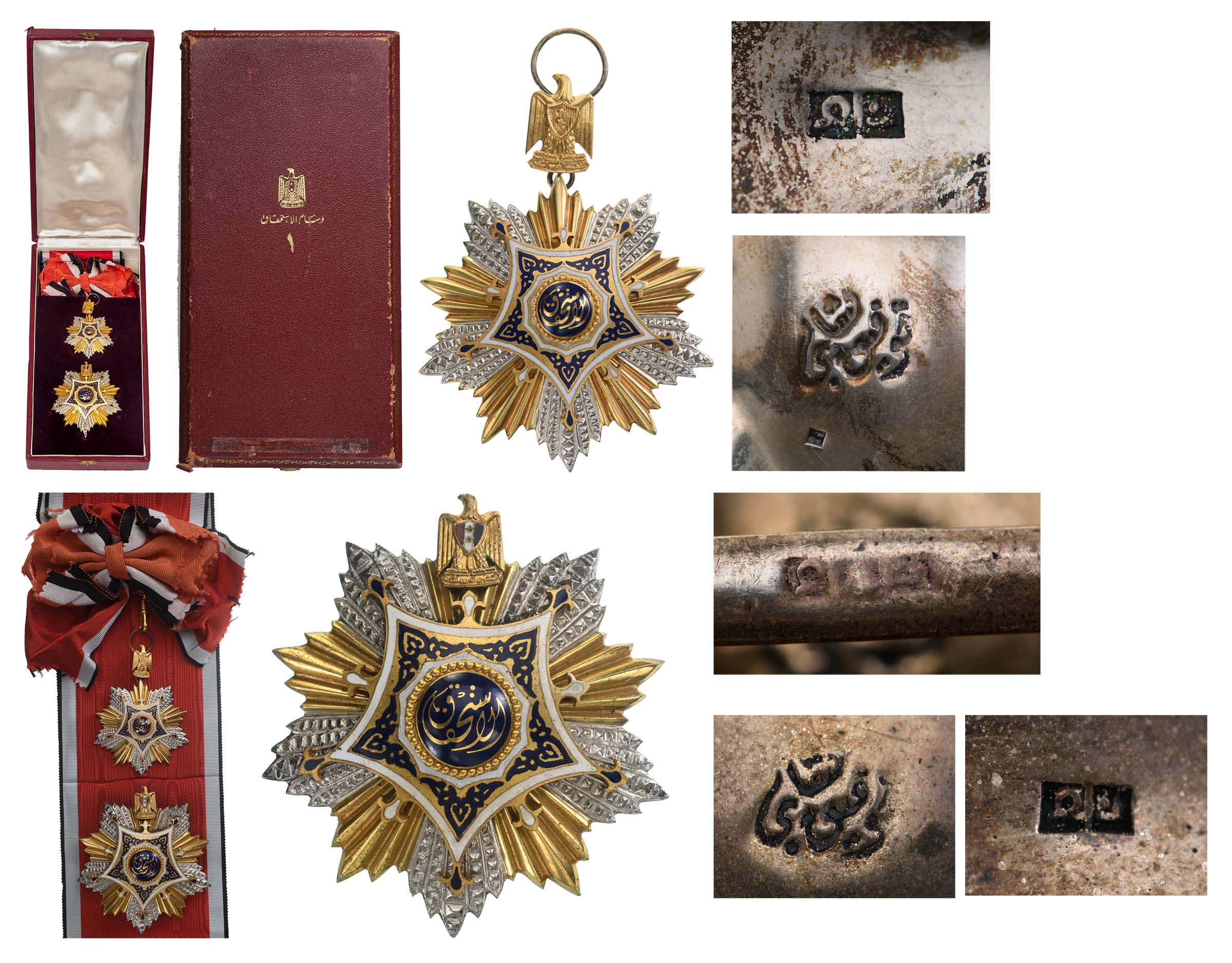 Grand Cross Set, 1st Class, 3rd Model instituted in 1953. Sash Badge, 74x61 mm, partially gilt Silver, hallmarked, Arabic maker`s mark, enameled, superimposed part gilt enameled, with original suspension device, ring and long complete sash. Breast Star, 89x84 mm, partially gilt Silver, hallmarked, Arabic maker`s mark, superimposed parts enameled, reverse with long vertical pin, in case of issue, with gilt monogram on the lid. very attractive set, in superb condition. I