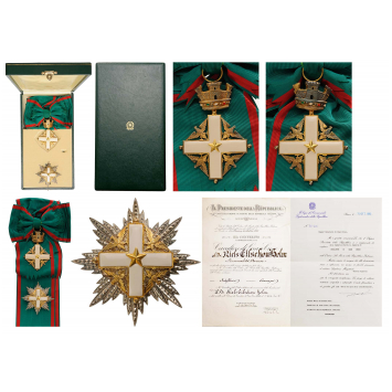 Grand Cross Set, 1st Class, 1st Type, instituted in 1951. Sash Badge, 100x71 mm, gilt Bronze, both sides enameled, both central medallions gilt bronze, enameled, original suspension ring and long sash. Breast Star, 84 mm, Silver with brilliant cut rays, maker`s mark "Johnson, Milano-Roma" superimposed parts gilt silver, enameled, reverse with vertical thin pin, in case of issue by "Johnson, Milano", with gilt weapon on the lid and awarding document to a Danish High Official, dated 1993 and authorization letter. Superb set! I