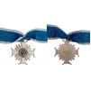 Commander's Cross. Neck Badge. 60 mm., Silver-plated, white enameled cross with silver beams between the arms, painted enameled centre medallion with the image of St. Dyonisos, blue enameled outer circlet, with Greek inscription, original supension ring and ribbon. I