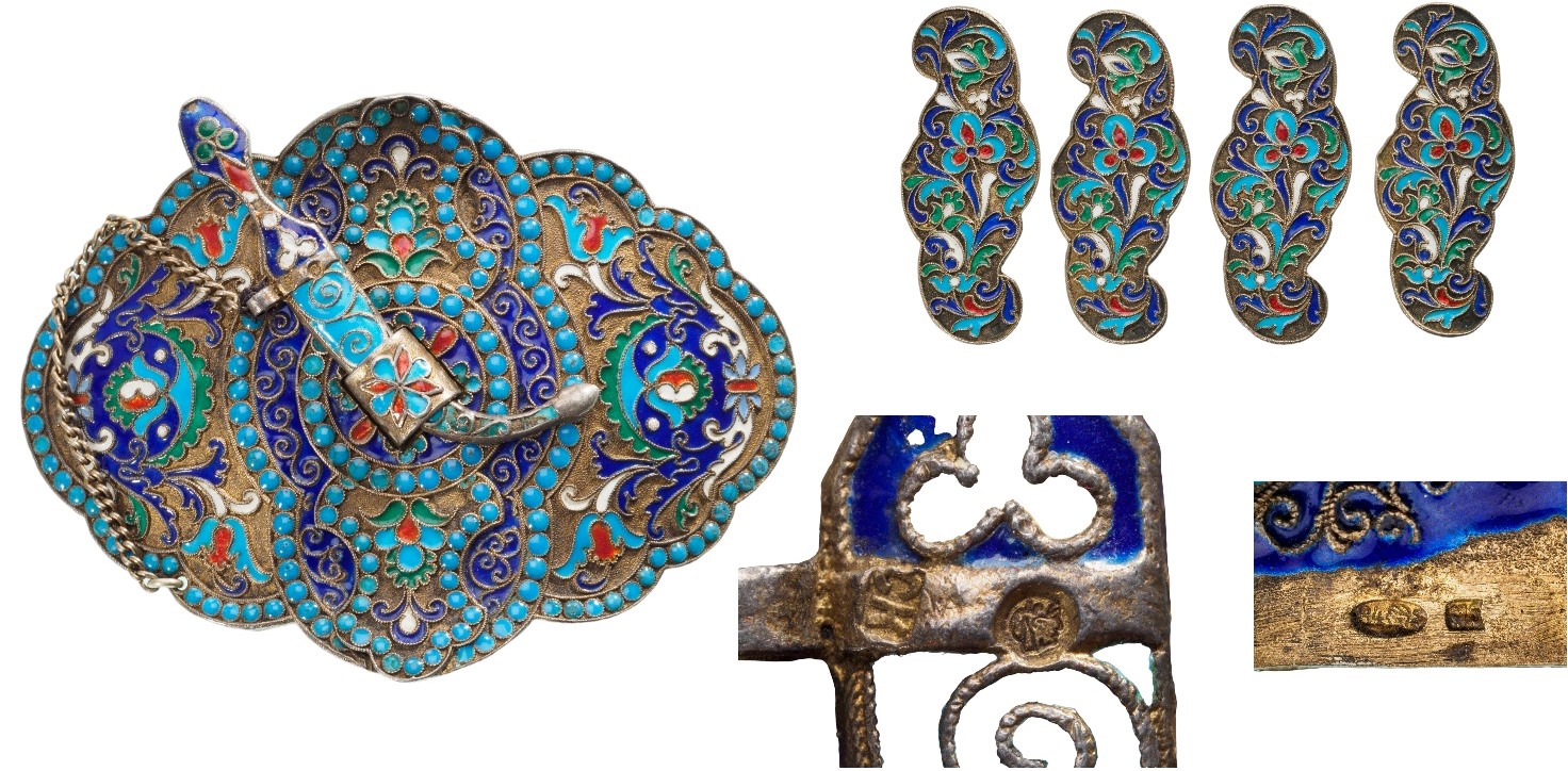 Ceremonial belt buckle (two sections) in enamelled silver and its four decorative side brooches, model with fastening slides on the reverse, large floral decoration with glazing beads and turquoise pearls, small kinjal knife in its sheath on the buckle. The decor suggests a wedding object. Indo-Afghan work from the middle of the 20th century. Total weight 99.8 g, dimensions 9 x 6.5 cm for the buckle, 5 x 2 cm for the bars. Good general condition, very fresh. Superb! I