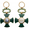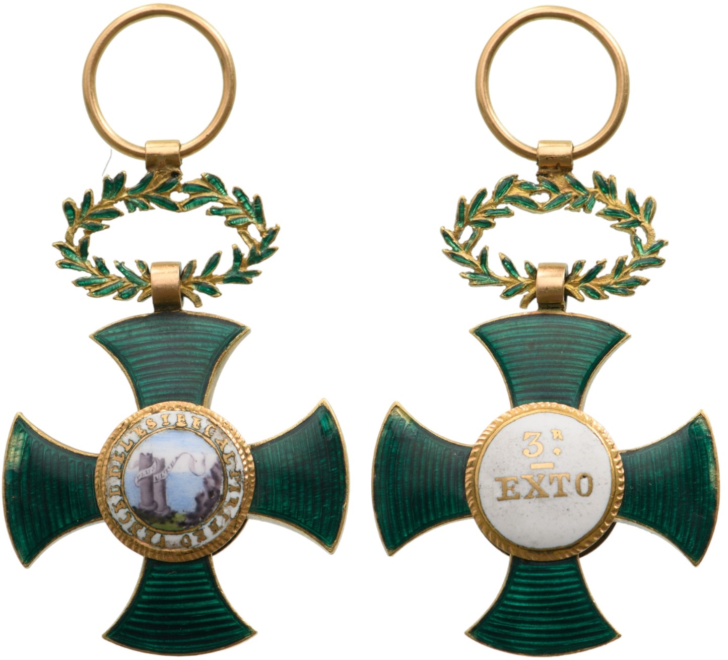 Breast Badge, 39,0 x 26,0 mm., GOLD, Green enamel Officer’s Cross in Gold with curved arms and ends; centre medallion with fine miniature painting representing the pillars of Hercules and a cliff; gold-bordered, white enameled reverse centre medallion, bearing the inscription “3.ro EX.TO” painted in black; green enameled, upper laurel wreath with round, gold ring.