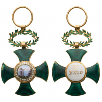 A beautiful example of this rare cross, instituted on March 31st, 1815, by King Ferdinand VII, for the troops under the Duke of Albuquerque, for distinguished merits on the Isla de Leon and in the defense of Cadiz, where the attacks of the French were withstood from 1810 to 1812; excellent condition. Boguna, p. 337