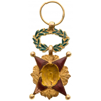 Breast Badge, 26,0 x 14,0 mm., GOLD, Officer’s Cross in Gold, four-armed, red enameled vertical star, flanked by gold beams; missing centre medallion; upper laurel wreath with green enameled details; smooth, slightly concave reverse; original golden suspension ring.