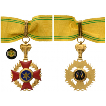 Commander's Cross, instituted in 1960. Neck Badge, 71x44 mm, gilt Bronze, maker's mark "A. B. - Arthus Bertrand - Paris", one side enameled, original suspension device and long complete ribbon, with rosette. A superb badge, in mint condition! I