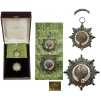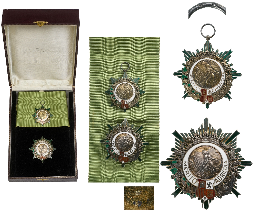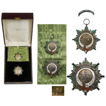 Grand Cross Set, 1st Class, instituted in 1905. Sash Badge, 63x59 mm, partially gilt Silver, multipart construction, superimposed parts gilt Silver, enameled, original suspension ring and uncut sash. Breast Star, 71 mm, partially gilt Silver, multipart construction, superimposed parts Silver, enameled, reverse with long ornamented vertical pin and two side hooks. In original case of issue by Villanueva y Laiseca JOYEROS Madrid". Rare and very attractive set in perfect condition! R! I