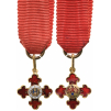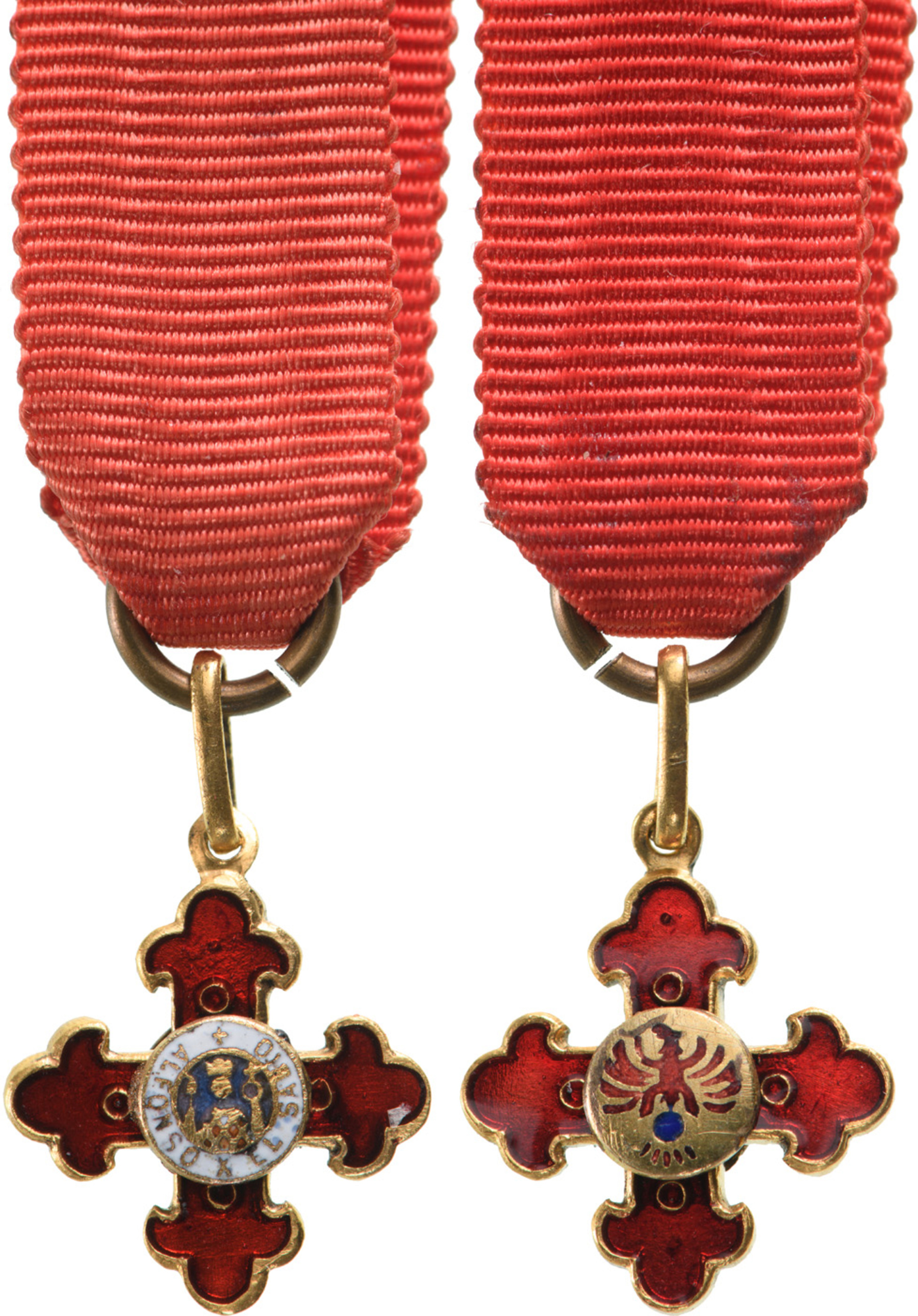 Officer`s Cross Miniature, instituted in 1902. Breast Badge, 15x13 mm, gilt Silver, enameled, central medalions gilt and enameled, original suspension ring and ribbon. Superbe and mint condition. !