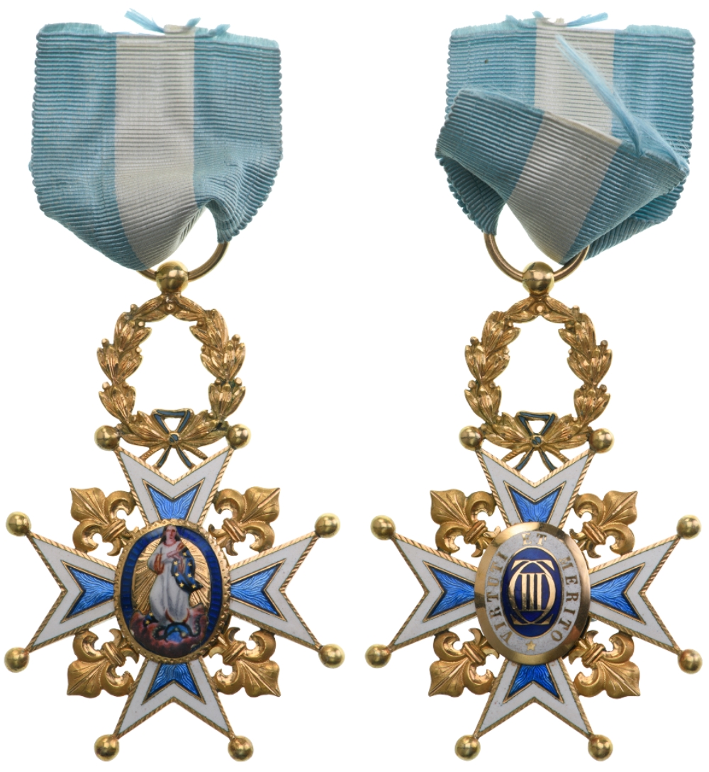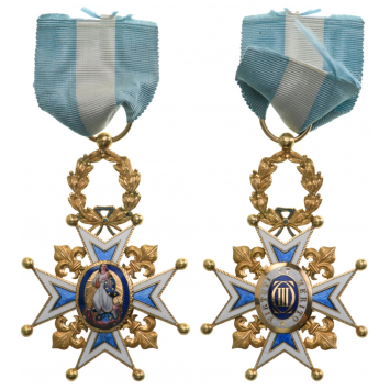 Officer`s Cross, 2nd Part of the 19th Century, 4th Class, instituted in 1771. Breast Badge, 67x45 mm, GOLD, approx. 18 g., both sides enameled, both central medallions GOLD, enameled, original suspension ring and ribbon.