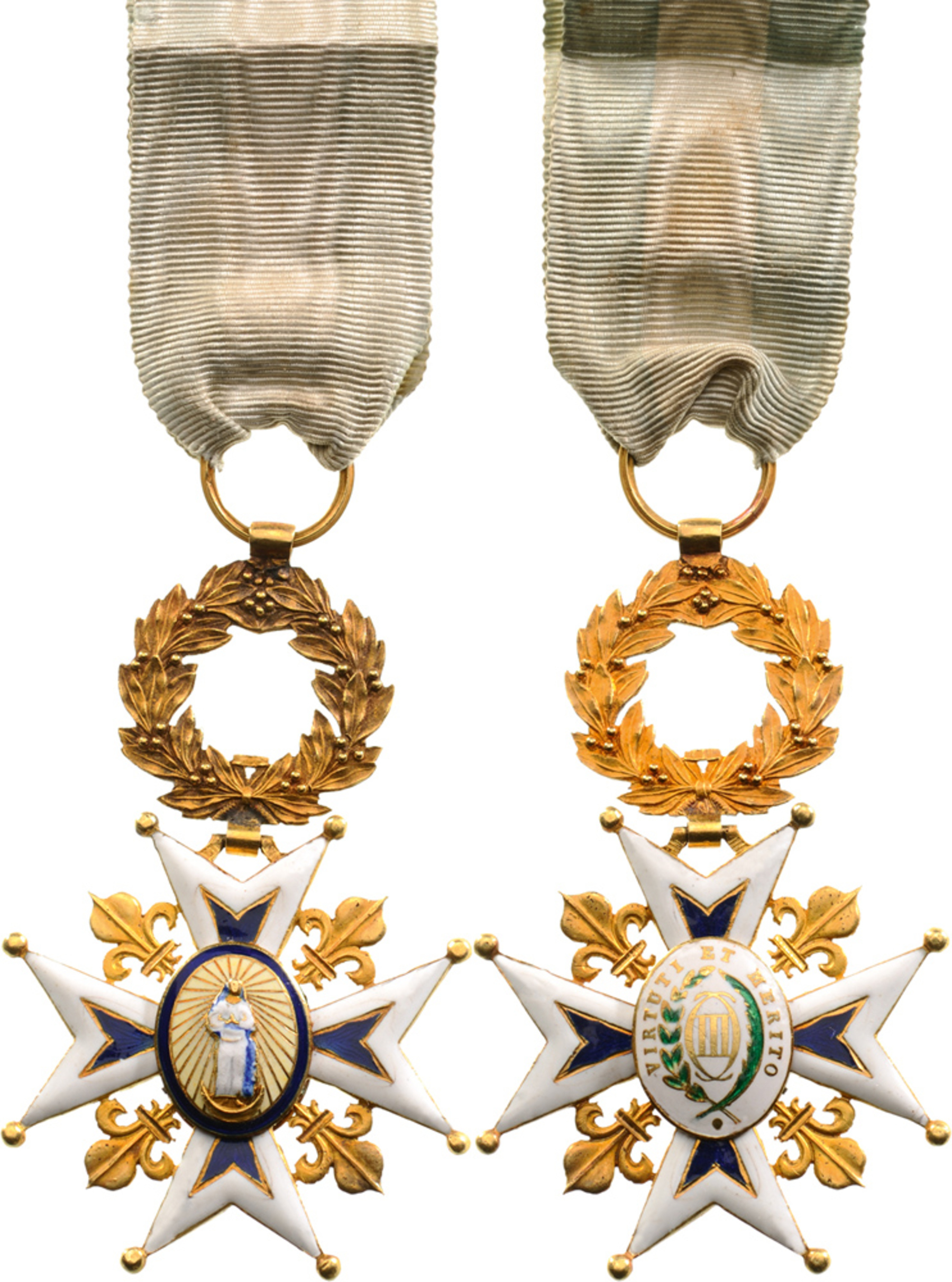 Knight's Cross, 1st part of the 19th Century, 1st Type, 4th Class, instituted in 1771. Breast Badge, 35 mm, GOLD, both sides enameled, both central medallions GOLD, enameled, original suspension ring and ribbon. Very rare and attractive! I- RR!