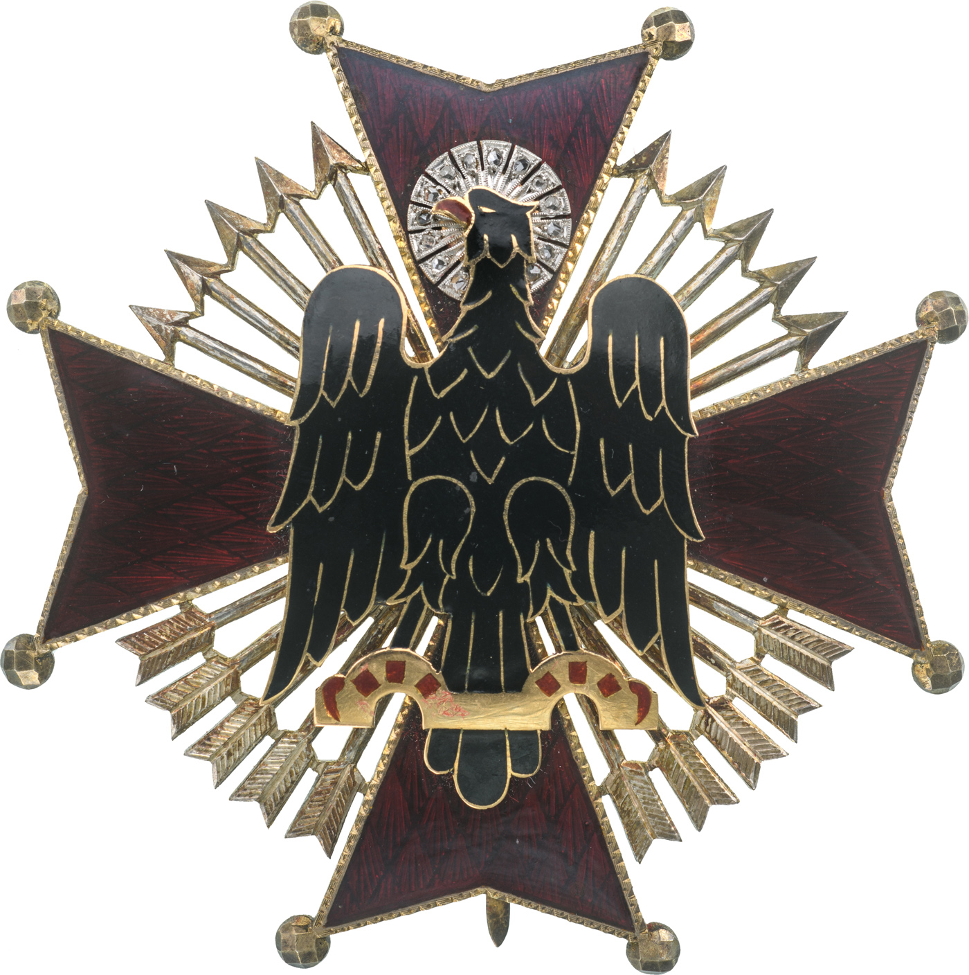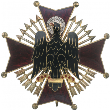 Grand Cross Star in Diamonds, instituted in 1944. Breast Star, gilt Silver, 75 mm, multi part construction, superimposed part gilt, adorned with 14 diamonds, decorated long vertical pin and two side hooks. Superb and very rare! I RR!