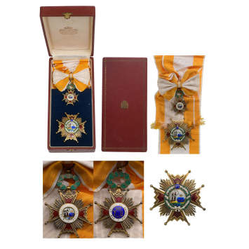 Grand Cross Set. Sash Badge, 65x44 mm, gilt Silver, red enameled arms, obverse centre medallion with enameled details, within white enameled outer circlet with the Order`s motto in gold lettering, dark blue enameled reverse centre medallion with applied, crowned monogram in gold with chiseled details, white enameled outer circlet with inscription in gold lettering, green enameled, laurel wreath, large, round suspension ring, original sash ribbon with bow. Breast Star, 77 mm, gilt Silver and separately-made, gold and red enameled arms` fields, centre medallion in the finest enamel work, framed in gold with green enameled laurel leaves and white enameled scroll with inscription, blue enameled , crowned upper escutcheon with chiseled monogram. In original case of issue by Cejalvo, Madrid with gilt weapon on the lid. A superb old set in perfect condition! I