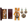 Grand Cross Set. Sash Badge, gilt Silver, 65x44 mm, red enameled arms, obverse centre medallion with enameled details, within white enameled outer circlet with the Order`s motto in gold lettering, dark blue enameled reverse centre medallion with applied, crowned monogram in gold with chiseled details, white enameled outer circlet with inscription in gold lettering, green enameled, laurel wreath, large, round suspension ring, original sash ribbon with bow. Breast Star, 69 mm, gilt Silver and separately-made, gold and red enameled arms` fields, centre medallion in the finest enamel work, framed in gold with green enameled laurel leaves and white enameled scroll with inscription, blue enameled , crowned upper escutcheon with chiseled monogram, the reverse, in wooden case by "S.G.A.B.".