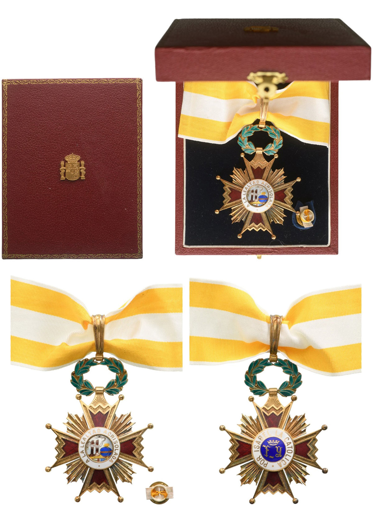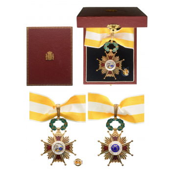 Commander`s Cross, 3rd Class, instituted in 1815. Neck Badge, 79x57 mm., gilt Silver, superimposed parts gilt enameled, both central medallions gilt, enameled, original suspension wreath, loop and ribbon, in case of issue by "Cejalvo, Madrid" with gilt and enameled weapon on the lid and lapel hole rosette. I