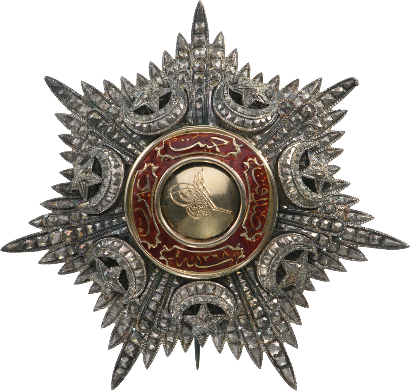 Grand Officer's Star, 2nd Class. Breast Star, 83 mm., Silver, Turkish hallmarked, in chiseled and pierced silver with gold centre medallion also with the Sultan`s Tughra, with red enameled details and applied scrolls with inscriptions, the reverse with concave counter-medallion bearing the escutcheon of the Turkish Imperial Mint, broad pin and two hooks. A beautiful star, in extremely fine condition. I