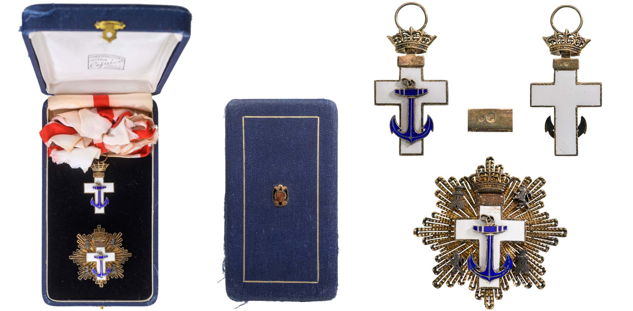 Grand Cross Set, 1st Class, instituted in 1866. Sash Badge, 53x28 mm, gilt Silver, hallmarked, multipart construction, superimposed parts gilt Silver, enameled, original suspension ring and cpmplete sash. Breast Star, 60 mm, gilt Silver, multipart construction, superimposed parts Silver, enameled, reverse with long ornamented vertical pin and two side hooks, in case of issue by "Cejalvo, Madrid" with gilt and enameled weapon on the lid. Scarce and very attractive set in perfect condition! I R!