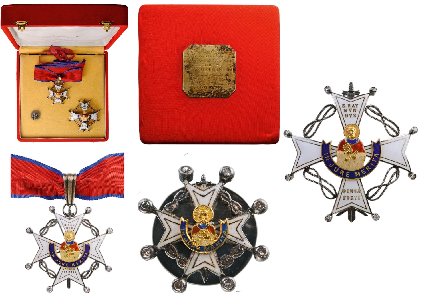 Grand Officer`s Set in Diamonds (or "Distinguished Cross of 1st Class"): white enameled, Silver Cross of Maltese Type, 53 mm, the ball-finials to the tips, set with brilliants, flanked by Savoy`s knots, the centre with the image of the saint in gold with enameled details, blue enameled scroll with motto "IN JURE MERITA",in gold lettering, grooved ribbon ring and original neck ribbon with ties. Breast Star, 77x73 mm, in Silver with white enameled arms, flanked by Savoy`s knots,the tips, also set with brilliants, gold centre, with finely enameled details, bright-polished reverse with vertical, gold pin and two side-hooks, lapel miniature in silver and enamels, also set with tiny brilliants. In the original presentation case, covered with red silk, with maker`s mark of Masriera Y Carreras, Barcelona, printed on the inner cushion, the lid, with a gilt silver plate engraved: "La Camara Oficial de Comercio, Industria y Navigacion de Barcelona AL IL MO. SR. D. MANUEL GUBERN PUIG Cruz distinguidade 1a Clase de la Orden de San Raimundo de Penafort". With 24 diamonds for a total of 1, 352 ct. A beautiful set of the highest quality, of this order, instituted in 1944 as a reward for eminent merits in the field of law and justice. I RR!
