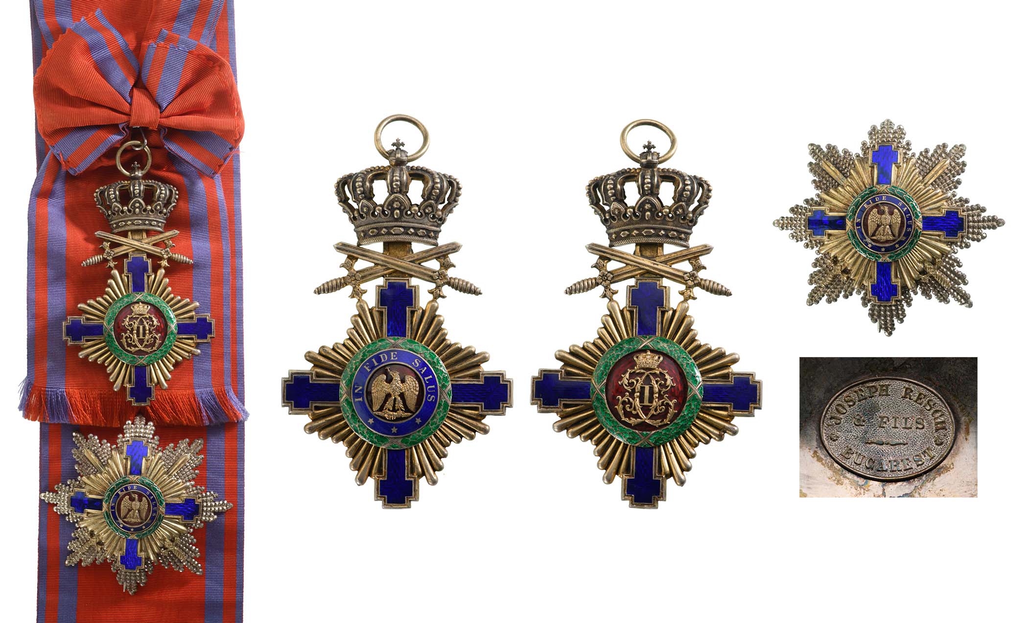 Grand Cross Set, 1st Model (1877), for Military in Time of Peace. Sash Badge, 117x72 mm, Silver gil, both sides enameled, original suspension ring and long complete sash. Breast Star with Swords, 92 mm, Silver, superimposed part gilt and enamelled, brilliant cut, maker`s mark "Joseph Resh Fils-Bucaret", long pin on reverse. Very rare complete set, in superb condition! RR! I