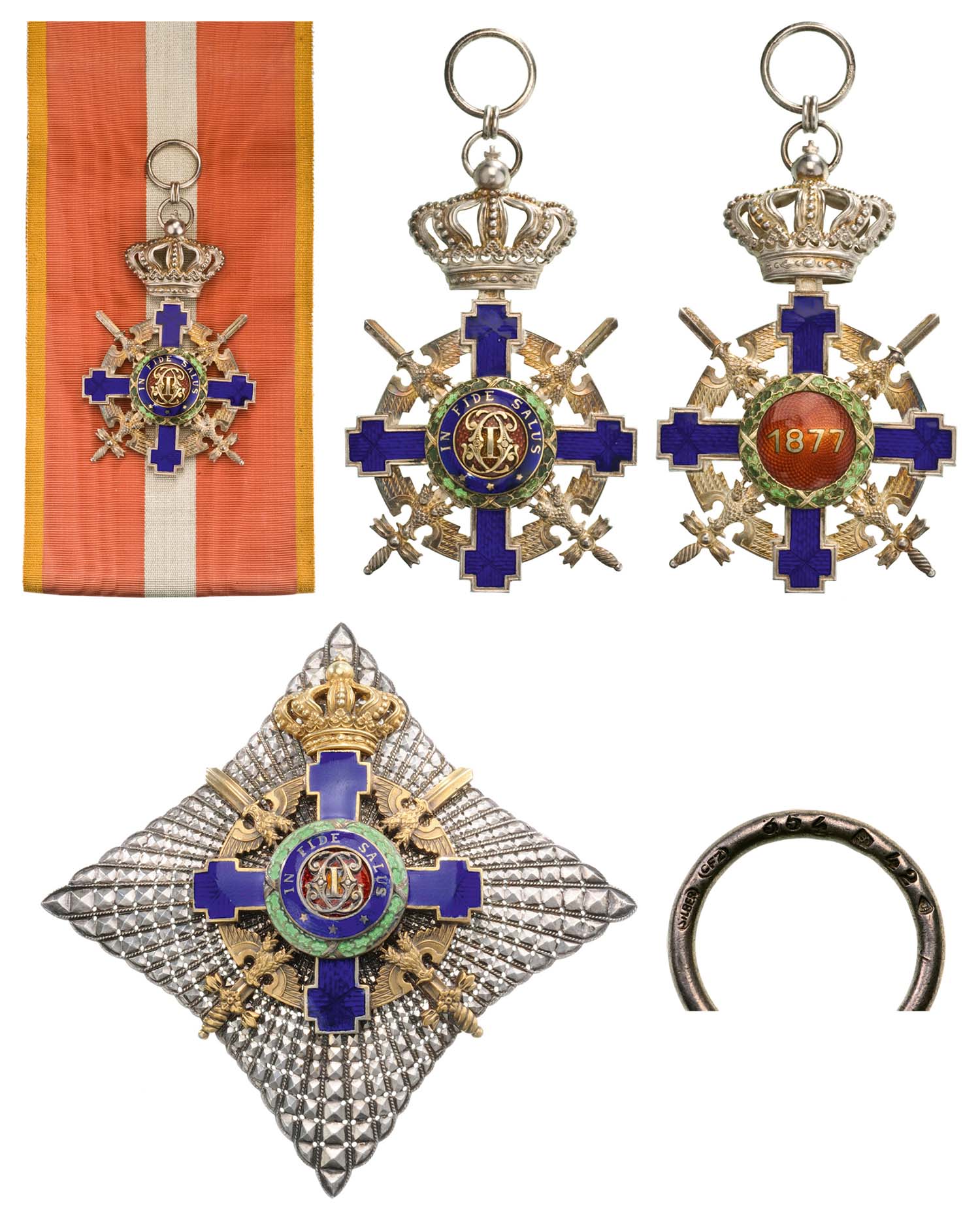1st Class Set for Military (1938). Sash Badge with swords, 86x57 mm, Silver, both sides dark blue enameled obverse medallion with cipher of Carol I, reverse medallion with 1877, original crown and suspension ring, hallmarked "SILBER, 354 Mn 42, crown", maker‚`s mark "cfZ", original sash. Breast Star with swords, 90 mm, Silver, superimposed parts gilt and enameled, brilliant cut, multipart construction, reverse with medium pin back, hallmarked "SILBER, 545 Mn 41, crown", maker‚`s mark "CFZ". Extremely rare set and model awarded to only 25 recipients in 1938! I RR!