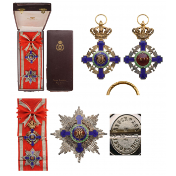Grand Cross Set, 2nd Model (1877), for Civil. Sash Badge, 92x61 mm, gilt Silver, hallmarked"39-34-ARG-RESCH-"both sides enameled, original suspension ring and long unsewn sash with ribbon bow. Breast Star, 75 mm, Silver, hallmarked on the pin "33-34-ARG" superimposed part gilt and enameled, brilliant cut, maker`s mark "Joseph Resch Fils-Bucarest", thin pin on reverse in original case of issue by Joseph Resh Fils Bucuresti", inner part missing, with gilt monogram on the lid. Superb! I