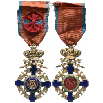 Officer`s Cross, 2nd Model (1938), for Military in Time of Peace. Breast Badge, 69x43 mm in gilt Bronze, enameled, with original suspension ring and ribbon with rosette. Obverse medallion with cipher of Carol I, reverse with 1877. Very rare model, in superb massive fabrication!! I RR!