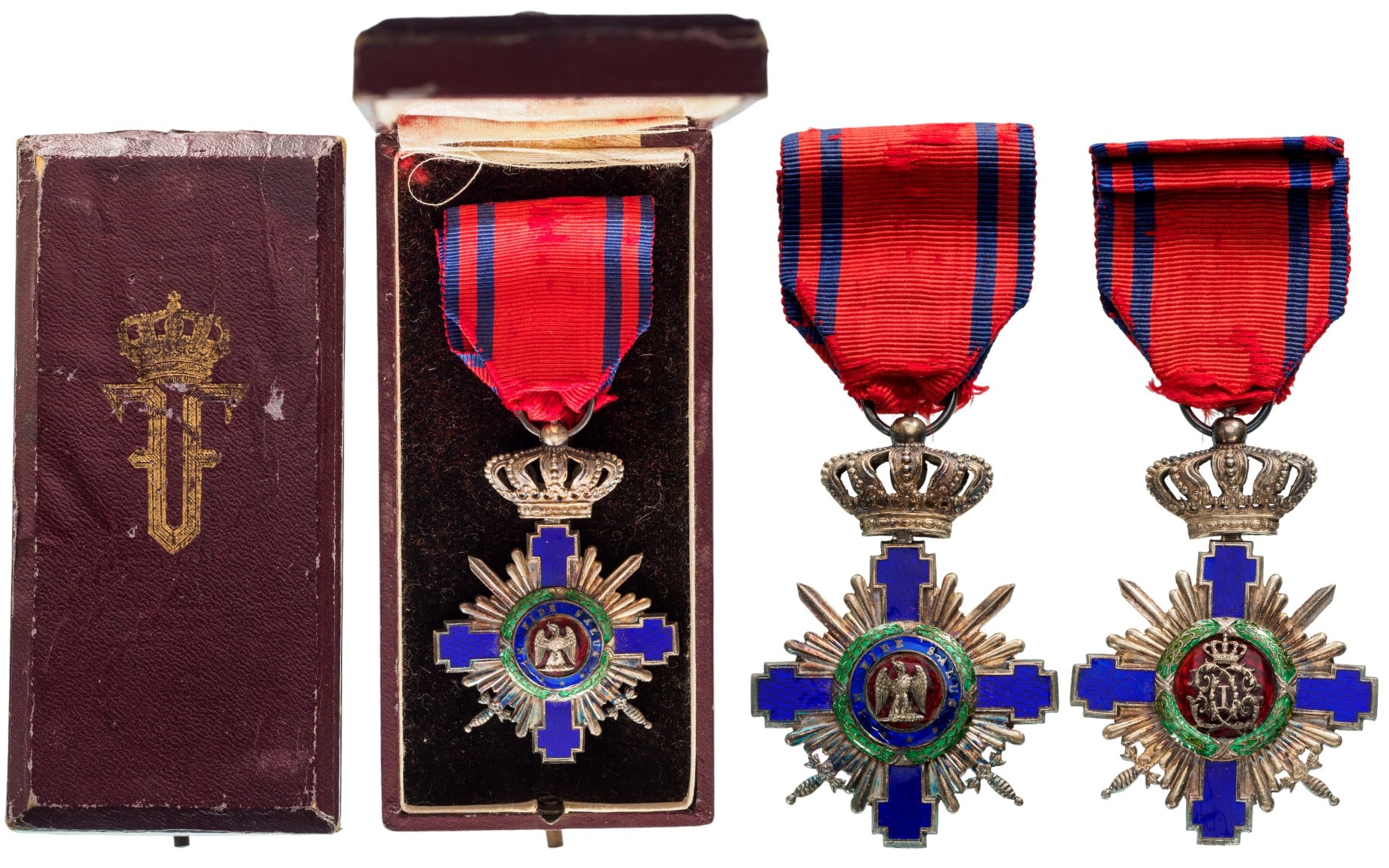 Knight's Cross, 1st Model (1877), for Military. Breast Badge, 65x43 mm, Silver, superimposed part enameled, original suspension ring and ribbon, in case of issue by "Lemaitre, Paris", with gilt monogram on the lid. A superb French fabrication, in very fine condition! I -