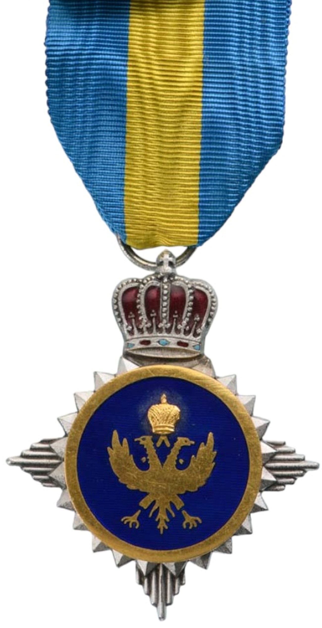Breast Badge, 68 mm., gilt and silvered Metal, radiant cross in the style of a breast star, central medallion gilt and blue enameled, Imperial crowned eagle at center. A very rare probably exile medal of a pretendant of the Romanov Dynasty! I RR!