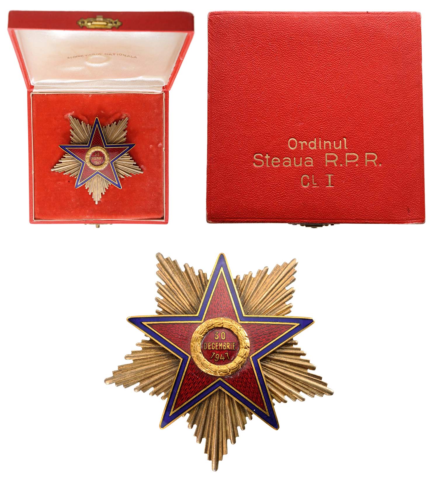 1st Class Star, 1st Model (1948), Special Class. Breast Star, 70 mm, gilt Silver, partially enameled, multipart construction, medium pin on reverse, in original very rare case of issue. This order in its 1st form, which was in use for only one year (1948), awarded to the persons which by their social, cultural and scientific activity have contributed to the development of the socialist system. Certainly one of the rarest Romanian communist orders, especially the high classes! I RR!