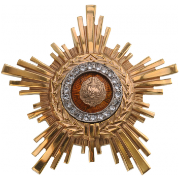 2nd Class, 3rd Model (1966-1989). Breast Star, 62 mm, GOLD with Pastes, 47.1 g, center enameled, with thin pin back. This order was awarded to the persons who by their social, cultural and scientific activity have contributed to the development of the socialist system. Awarded only to Romanian and Foreign high dignitaries, very rare! I RR!