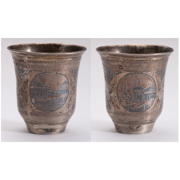 Silver-gilt and niello, decorations in coffered structures and floral pattern, height 5 cm, weight 35 g, Moscow 1873, standard guarantee 84, incomplete silversmith mark. Good condition.
