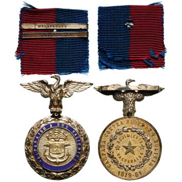 City of Valparaiso Medal for Combatants, 1879-1881, instituted in 1881. Breast Badge, 49x30 mm., Silver, enameled, variant "Rejimento Valparaiso", original ribbon with two barrettes "MIRAFLORES" and "CHORILLOS". Awarded to the troops recruited in the city of Valparaiso. Gill. p. 120 Ross Ch23c. I RR!