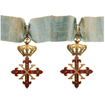 Neck Badge, 88x57 mm, GOLD, 26.2 g., and red enamel, both sides of the cross with finely chiselled details, either under the translucent enamel, hinged suspension crown with Bourbones’ fleurs-de-lys, polished upper orb and cross, grooved ribbon ring (French, “owl” mark), and original, silk neck ribbon. A beautiful piece of the best, probably French, manufacture from ca. 1860/70, excellent condition. I R!