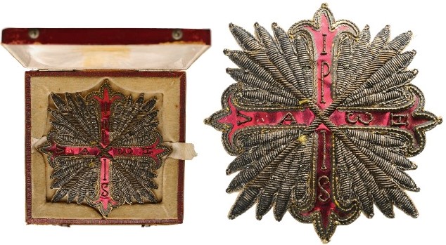 Early, embroidered Breast Star, 80 mm, thick rays of silver twisted wire, red lacquered sheet-silver cross with Gold embroidered letters, the border of tiny, gold sequins, the reverse, backed with thin sheepskin, fitted with a vertical, hinged pin assembly, in the original, red morocco case, with inner, fitted compartment. An excellent, star of great rarity, from the earliest 19th Century, extremely fine condition. I RR!