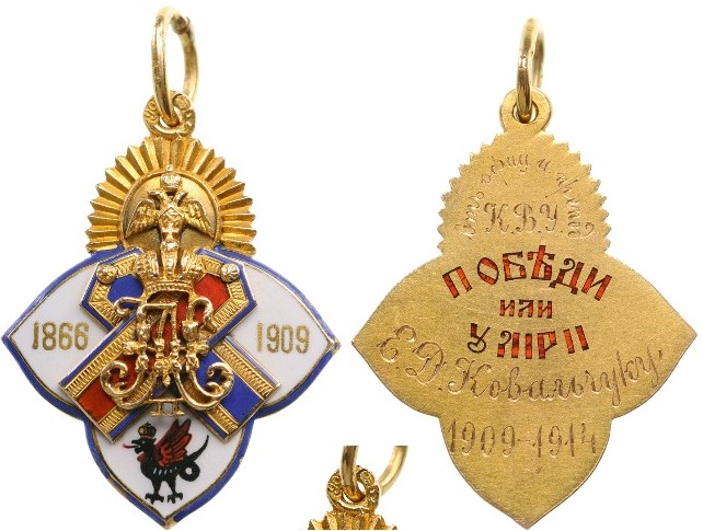 Breast Badge, 35x26 mm., GOLD and polychrome enamelwork and separately-made Imperial monograms of the tsars Aleksander II and Nicholas II, the reverse, with red enameled motto “To win or to die” and engraved dedication. An extremely rare badge, maybe UNIQUE in Gold, in excellent condition. Bibl.: Д. И. Петерс: “Жетоны Рoссийской Императорской Армии” (Jettons of the Russian Imperial Army), Moscow, 1988, pp. 259-260, n° 195a. I RR!