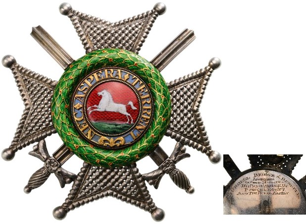 Commander’s Breast Star with Swords, 80 mm, Silver, chiselled and pierced arms with Golden swords between them, centre medallion with white enameled “running horse” on a bright red enamel ground with green enameled “field” below, pale blue enameled outer circlet with motto “NEC ASPERA TERRENT” in separately applied, finely chiselled gold lettering, within a thick, green enameled laurel wreath with orange-red berries, the reverse with centre disc, bearing the engraved maker’s mark “RUNDELL BRIDGE & RUNDELL. JEWELLERS TO THEIR MAJESTIES His Royal Highness the PRINCE REGENT AND THE ROYAL FAMILY.” vertical, broad golden pin. An early, very rare and fine star, from ca. 1830 in very fine condition.
