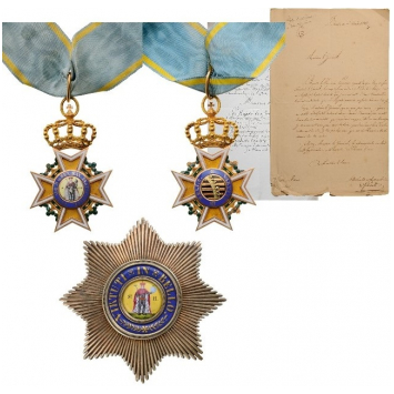 The historically important Commander’s 1st Class of the Order, awarded to General Jean-Baptiste Dommanget on July 16th, 1813: the decoration, in the model of 1807, 83x50 mm, white filleted, massive gold cross; “trefoiled” crowns with green enameled details between the arms (some chips); enameled centre with fine miniature portrait of the Saint wearing armour and robes and the inscription “S HENR”; blue enameled outer circlet with “FRID . AUG. D.G. REX SAX. INS TAURAVIT.”; reverse centre with red-golden, chiselled medallion with black enameled bands and applied, diagonal, curved crown in gold of a lighter shade, within the blue enameled outer circlet with inscription “VIRTUTI IN BELLO” in gold lettering, with the text running downwards; fixed, upper crown, grooved link-ring in one piece with the upper orb; oval ribbon ring; full-length, original neck ribbon with long ties; Breast Star, 72 mm, with smooth, polished silver rays; yellow enameled centre medallion with finely painted image of the standing, Saint, wearing armor and royal attributes; blue enameled outer circlet with the golden motto « VIRTUTI IN BELLO » within grooved border; smooth reverse with vertical suspension fitting. The piece is accompanied by three documents: the original letter of bestowal, dated in Dresden, on July 16th, 1813 to Brigadier General Baron Dommanget; the official letter from the Counsellor of the King of Saxe, dated in Dresde, August 5th, 1813, announcing that the King awarded the Commander’s Cross of the Order, accompanying the first document and the order’s insignia and a further letter, dated in Paris, September 27th, 1814 and signed “Blacas” (Pierre Louis Jean Casimir de Blacas d’Aulps, Ministre de la Maison du Roi), informing that the King Louis XVIII gave his assent and authorization to wear the Saxon Order of St. Henry.