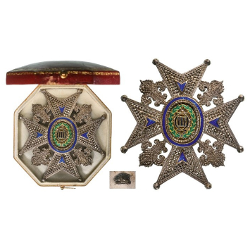 Numerary Commander’s Breast Star, 80x75 mm, Silver cross flanked by fleurs-de-lys, chiselled with a fine diamond-cut pattern, the arms with blue enameled details in Gold, oval centre medallion with the blue enameled monogram “C” within green enameled wreath in gold and blue enameled outer circlet oval, the reverse fitted with, vertical, round pin, struck with the jeweler’s mark of G. Yraburo, in its original, red morocco, octagonal case, its inner, lined wit ivory silk and velvet. An attractive star from the mid-19th Century in the finest quality, typical of this manufacturer, excellent condition. I