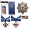Grand Officer's Set For Ladies, 2nd Model (1932). Neck Badge, 49 mm., gilt Silver, both sides red enameled, obverse medallion with cipher of Carol I, reverse medallion with "10 Maiu", original suspension ring, loop and ribbon. Breast Star, 66 mm., Silver, hallmarked "crown, 101", maker`s mark "Heinrich Weiss - Bucarest", on the superimposed parts enameled, multipart construction, thin size pin on reverse. In case of issue by "Heinrich Weiss - Bucarest", with gilt imprint on the lid and Royal monogram. Superb set of high rarity, in mint condition. I RR!