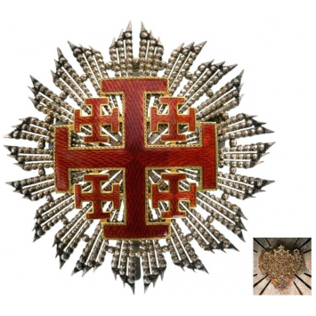 Grand Cross Breast Star, 80 mm., Silver, chiseled rays in the style of Portuguese stars, large centre in Gold with red enameled “T” cross enriched by chiseled border, flanked by further “T” crossed also red enameled, concave, polished reverse, fitted with pin, and the maker’s cartouche of Castells, Barcelona. A most probably unique piece, made expressely by order of a Portuguese dignitary from the 2nd half of 19th Century, in the best Spanish jeweler’s quality, excellent condition.
