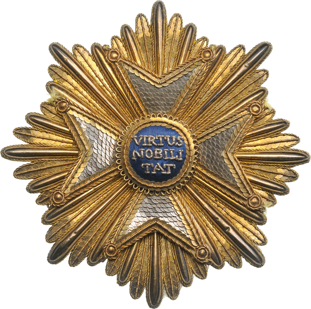 An early, embroidered Grand Cross Breast Star, 98 mm, the rays made of gilt sheet-silver and sequines, superimposed by the Order`s cross made of silver sequines bordered of gilt bullion embroidery, sea-blue cloth centre bearing the motto "VIRTUS NOBILITAT" made of gilt thread, within gilt outer circlet, plain reverse, with original paper backing.