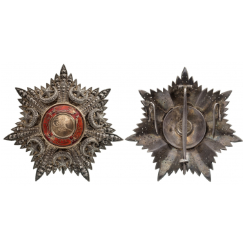 1st Class Star, Crimean Period. Breast Star, 96 mm., Silver, hallmarked, in chiseled and pierced silver with gold centre medallion also with the Sultan`s Tughra, with red enameled details and applied scrolls with inscriptions, the reverse with concave counter-medallion bearing the escutcheon of the Turkish Imperial Mint, broad pin and two hooks. A beautiful and very rare star from the Crimean period, in extremely fine condition. I RR!