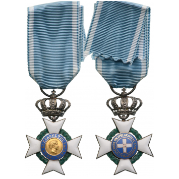 1st Type Knight's Cross, 43x29 mm, Silver, enameled, with centre medallions in gold, with King Otto's portrait (facing right) to the obverse and Bavarian colours to the reverse, hinged suspension crown, grooved ring and original ribbon. Rare and extremely fine condition. I- R!