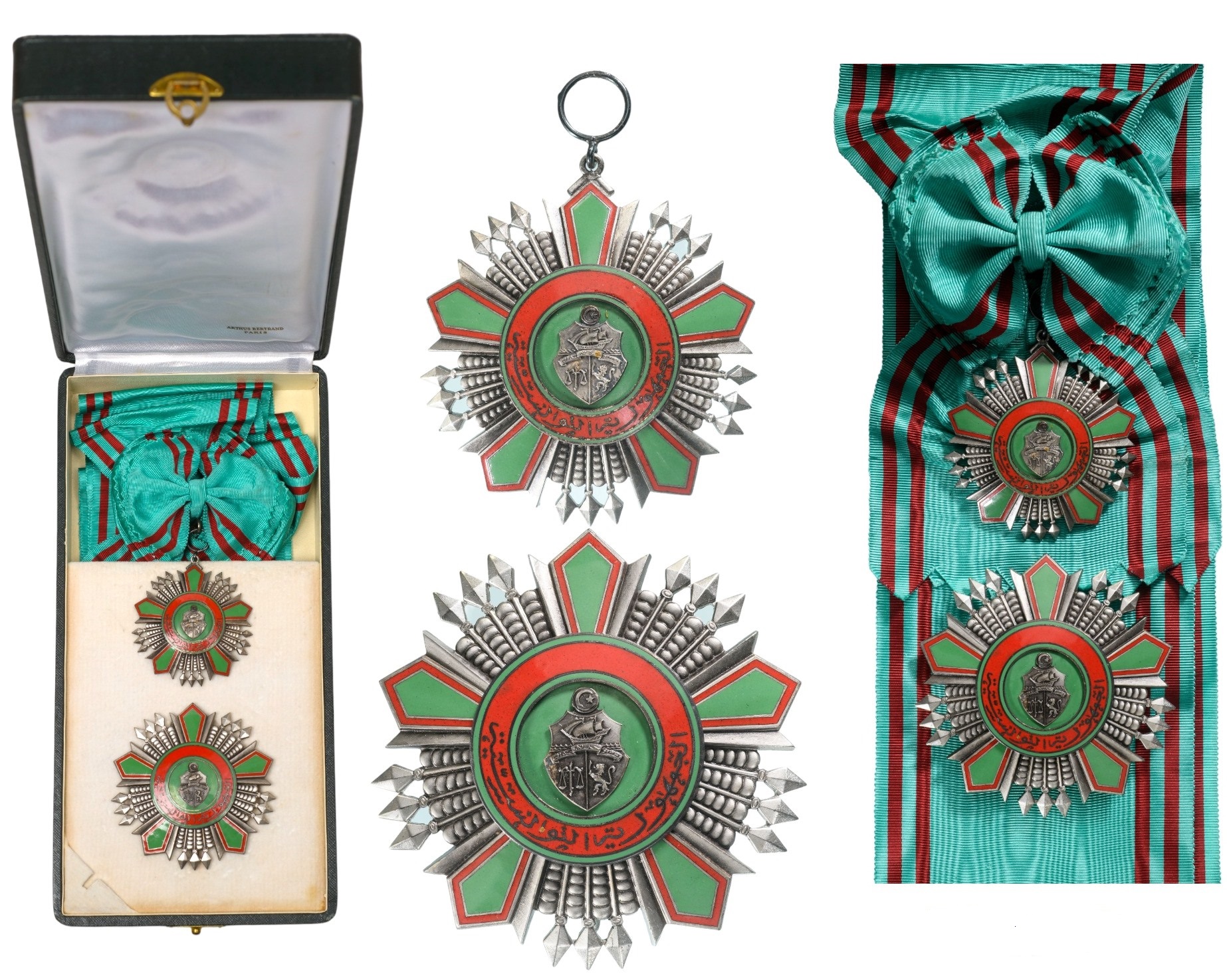 Grand Cross Set, 2nd Type, instituted in 1963. Sash Badge, 70x62 mm., Silver, one side enameled, original suspension ring and long complete sash. Breast Star, 86 mm., Silver, hallmarked, maker's mark "AB - Arthus Bertrand", silver centre with enameled details, smooth reverse, with vertical pin and two side hooks, in the original case of issue by "Arthus Bertrand - Paris". A superb set, awarded to a Belgian Prime Minister! Extremely fine condition! I