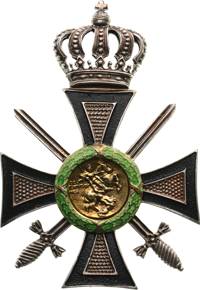 3rd Class Breast Star, 65x49 mm., gilt Silver, maker`s mark "Heinrich Weiss, Bucarest", the gold medallion on the obverse depicting St. George terrassing the dragon, on reverse medium pin. An extremely rare order in perfect condition, very seldom awarded exclusively for merits in war! I RR!