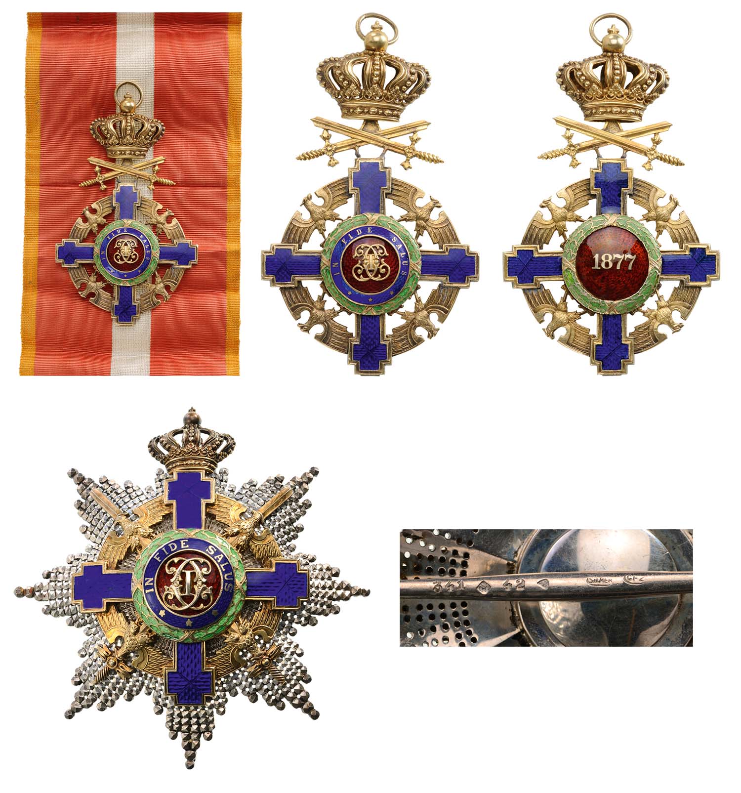 Grand Cross Set, 2nd Model (1938), for Military in Time of Peace. Sash Badge, 108x65 mm., gilt Silver, maker's mark "Resch", both sides dark blue enameled, obverse medallion with Carol I cipher, reverse medallion with "1877", with original crown, suspension loop and original unsewn sash. Breast Star with Swords, 75 mm., Silver, hallmarked "341-42, SILBER, crown", maker`s mark "CFZ", superimposed parts gilt and enameled, brilliant cut, multipart construction, reverse with medium pin back. Extremely rare set, only 15 pieces awarded!
