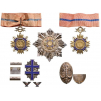 1. Order of Prince Pribina - Grand Officer’s Set of the Military Class. Neck Badge, 75x53 mm., in gilt Silver with polished arms formed as groups of four dagger-shaped beams, flanked by deep-sea blue enameled stylized mounts and rising double crosses, centre medallion with bust of the prince facing left within beaming outer circlet and blue enameled border, the reverse centre medallion depicting an archaic church within the motto “SAECULO NONO INSTANTE FUNDAVIT”, also within beaming outer circlet and blue enameled border, hinged crossed swords and laurel wreath and suspension ring (struck with marks to the reverse), original neck ribbon (frail). Breast Star, 90 mm., Silver with strong, faceted rays flanked by stylized arrow-tails, the centre as the badge of the order, but of reduced size, in gilt silver and deep-sea blue enameled details, within gilt silver-bordered, geometrical frame, flanked by silver, crossed swords, concave reverse with two nuts retaining the obverse and a scratched number “1409”, horizontal, strong round pin, struck with “987” and “K” marks. A most rare set of the order, excellent condition. 2. Order of the War Victory Cross - Third Class Badge, 52x35 mm., Silver with blue enameled double cross (lime leaves visible through the translucent enamel), sided by two groups of three lime leaves each and resting on a star of thin, polished beams, smooth reverse with frosted finish, strong, vertical pin, this, struck with “987” and “K” marks, together, two screwback (the nut, missing) ribbon miniatures, 12x20 mm each, in Silver, with enameled, Slovakian coat of arms.
