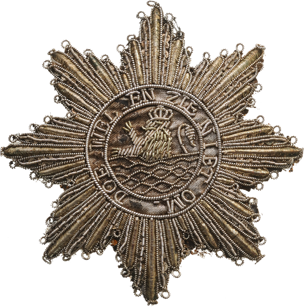 An embroidered Breast Star of the Order, 97 mm, the rays made of Silver thread with tiny loops to af x the star to the habit, round centre depicting a crowned rampant lion rising from waves, within the outer circlet bearing the motto "DOE WEL EN ZIE NIET OM", the reverse, with remains of the original, protective, green morocco leather backing.