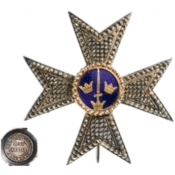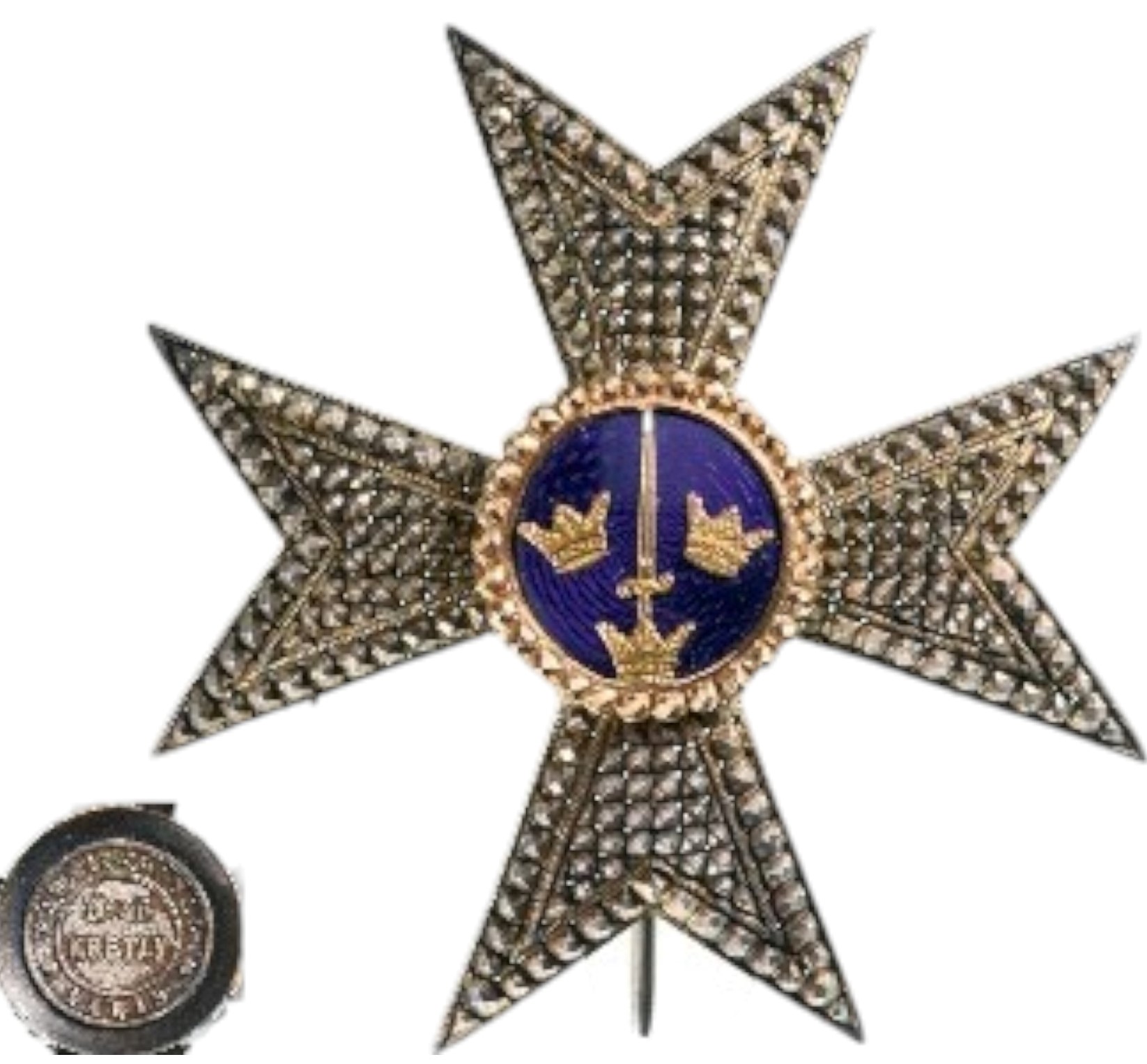 Breast Star of Knight Commander 1st Class, 70 mm., a cross of Maltese type, the arms of exquisitely chiseled and pierced silver, centre medallion in gold, with blue enameled field, bearing an upwardly pointing sword in Gold, within Sweden’s “three crowns”, outer circlet of diamond-cut Gold, the reverse fitted with vertical pin and the centre with maker’s escutcheon of Kretly, Paris.