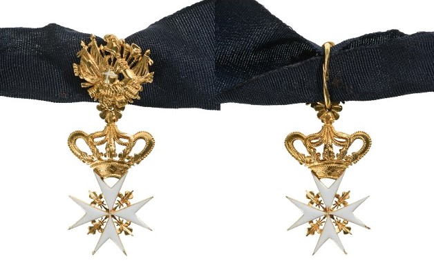 Early Knight’s Cross of the Order, 72x30 mm, GOLD, of somewhat reduced size, with white enameled arms, flanked by fleurs-de-lys, wide, bulbous crown fixed to the “fork” of the upper arm, by means of thin rivet, beautifully chiseled trophy, with polished cuirass and details, with rear ribbon-ring, and original, black silk original ribbon. A beautiful, rare cross from the very late 18th Century or the earliest years of 19th Century, Excellent condition. I R!