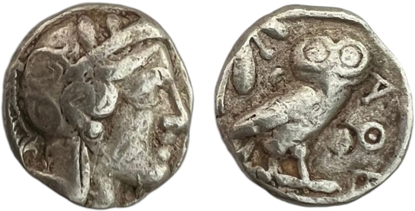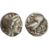 Silver, (16.52 g., 22 mm), Helmeted head of Athena right / Owl standing right, head facing; olive sprig and crescent behind. SNG Cop. 31; Starr pl. XXII, 7. s. VF