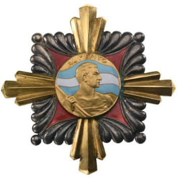 Grand Officer’s Breast Star (to be worn on its own), 81 mm., Silver, of roughly square form of polished rays and red enameled inner sections, the centre as a cross of golden, polished rays, round centre medallion with the allegoric image of a man holding an enameled waving flag at the Argentinian colours, on top, the motto “AL MERITO”, the reverse, fitted with vertical pin. A very rare badge of this order instituted by Juan Peron in 1946, discontinued in 1955, of beautiful design and manufacture, excellent condition. Argentina I RR!