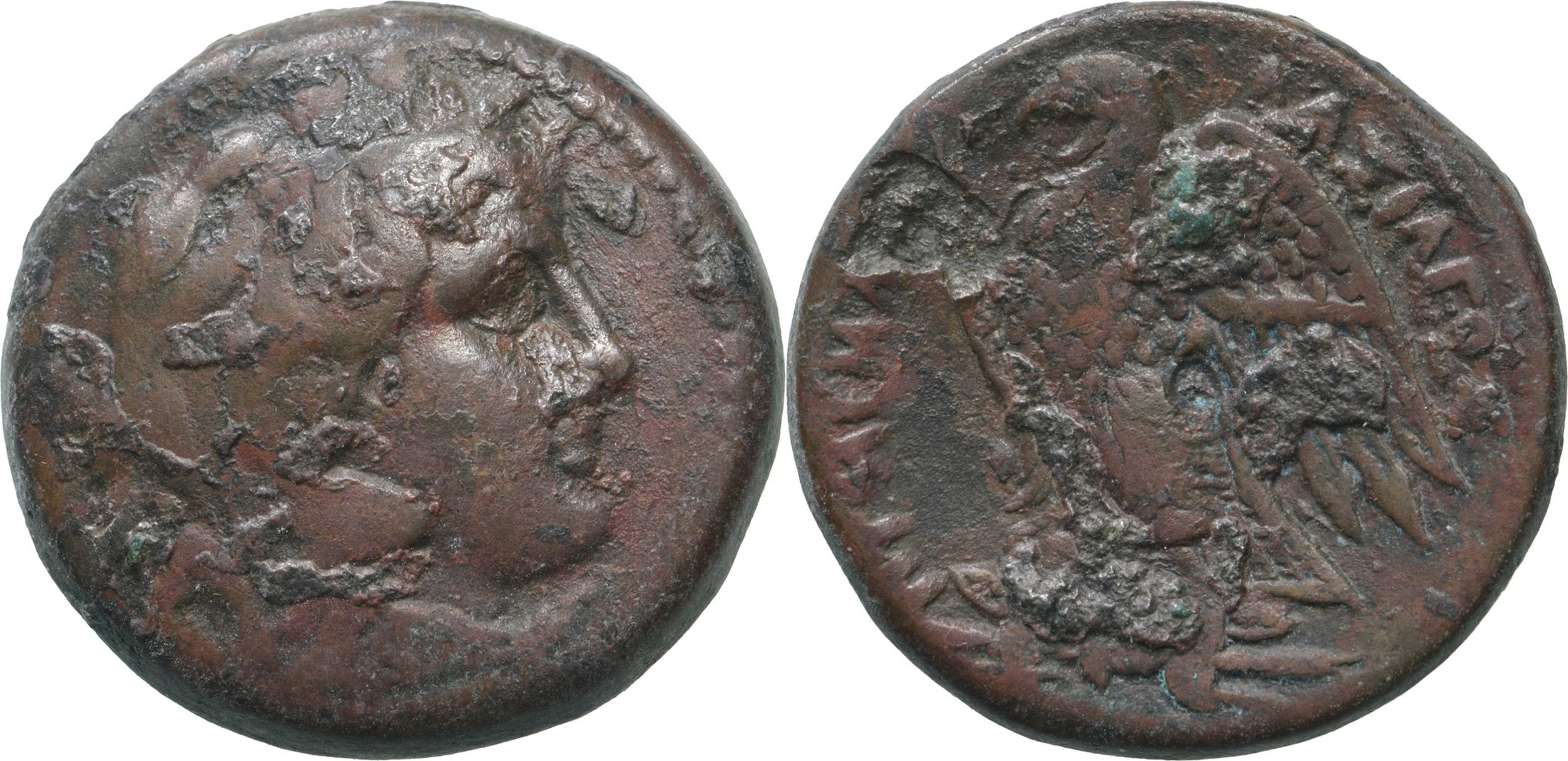 Diademed head of Alexander III right / Eagle with spread wings, standing left on thunderbolt, to left, aphlaston above helmet. CPE B23, Svoronos 172. VF+